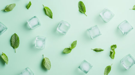 Cool ice cubes and fresh mint leaves on a light green background capture a refreshing summer vibe perfect for drinks.