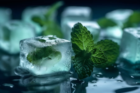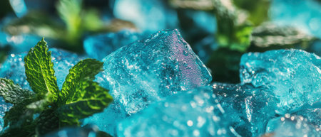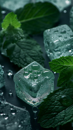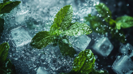 This visually captivating image features fresh mint leaves and ice cubes surrounded by sparkling water droplets, evoking a refreshing beverage experience.