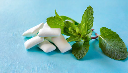 Chewing Gum with Mint Leafs on Table