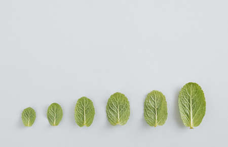 Fresh green leaves arranged in a row on the bright white background. Flat lay idea.