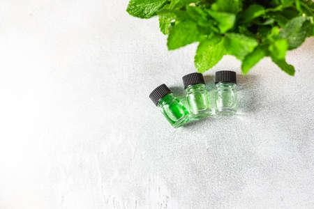 Oil of peppermint in small bottles, fresh green mint on white background.