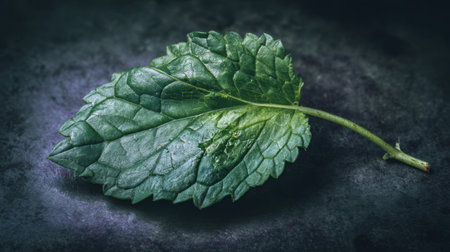 A vibrant green mint leaf sits on a textured dark surface, enhanced by water droplets. This image captures freshness and vitality, perfect for food or herbal themes.