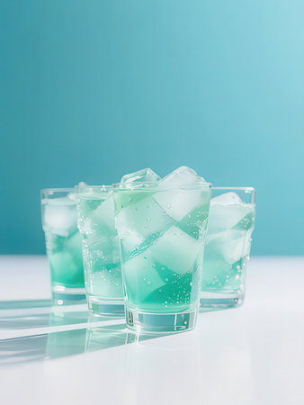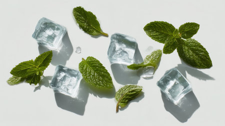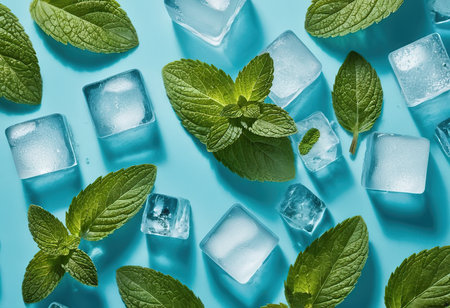 Fresh mint leaves and ice cubes create a refreshing composition ideal for summer beverages or cocktails