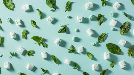 fresh mint leaves and chewing gum pads gracefully falling against a light blue background, evoking a sense of freshness and invigoration, creating a visually striking scene