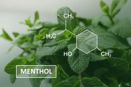 Illustration of menthol chemical formula and fresh aromatic green mint, closeup view