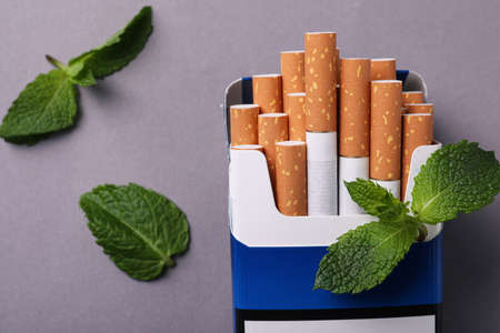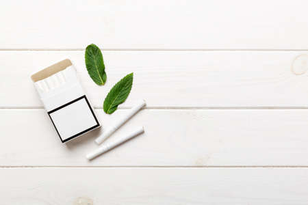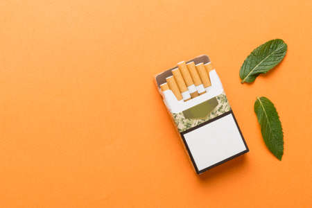 Pack of menthol cigarettes and fresh mint on colored table, Menthol cigarettes top view flat lay.