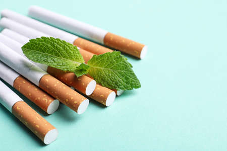 Menthol cigarettes and mint on turquoise background, closeup. Space for text