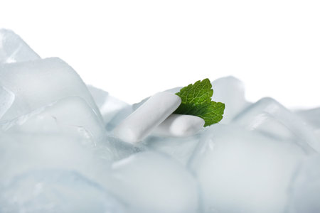 Chewing gums and mint on ice cubes against white background, closeup