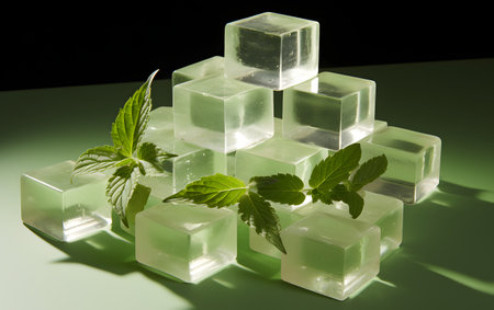 A visually appealing arrangement of fresh mint leaves resting on clear ice cubes, perfect for adding a refreshing touch to summer beverages and cocktails.