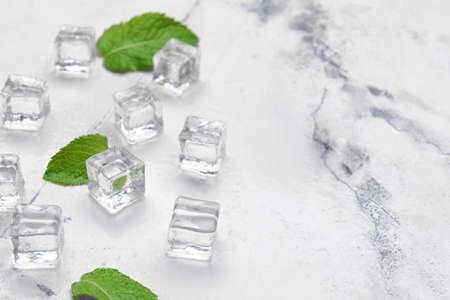 Fresh mint leaves are lying on ice cubes, copy space.