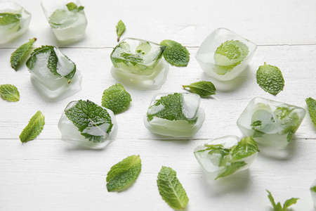 Ice cubes and mint leaves on light wooden background