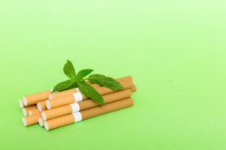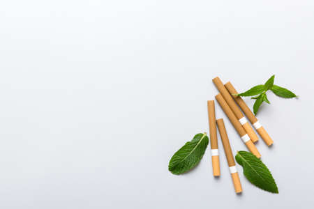 Menthol cigarettes and fresh mint leaves on colored background, Many cigarettes stacked together top view flat lay.