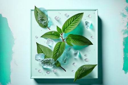 A background of mint leaves and ice cubes floating in the air, with light blue water droplets splashing around them. The overall color scheme is fresh green and white, creating an atmosphere full of freshness and vitality. This photo was taken using a Canon EOS R5 camera with high resolution and stunning detail capture, in the style of a fashion editorial. --chaos 30 --ar 16:9 --v 6.1 Job ID: 6b4ada86-a3c1-471e-84f4-79e6b250cd29