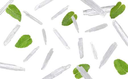 Menthol Crystal and Kitchen Mint, branch and green leaves isolated on a white background.