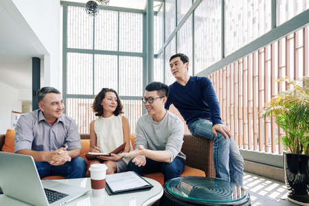 Cheerful multi-ethnic business team meeting in office lounge area and discussing project details