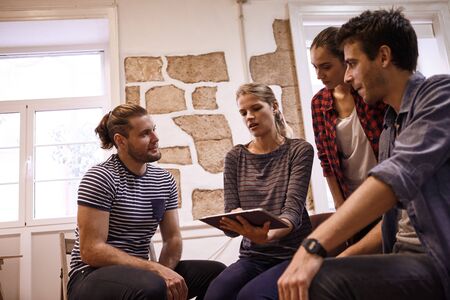 Group of young business people discussing business plan at modern startup office building