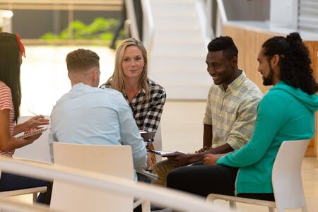 Front view of diverse business people sitting together and having a group discussion in a modern office
