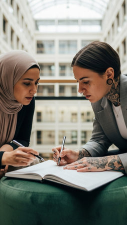 Vertical 9:16 full-body composition of two diverse colleagues--one wearing a hijab, the other heavily