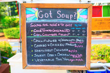 Chalkboard sign with pricing, menu board offering variety of soup at the farmers market.