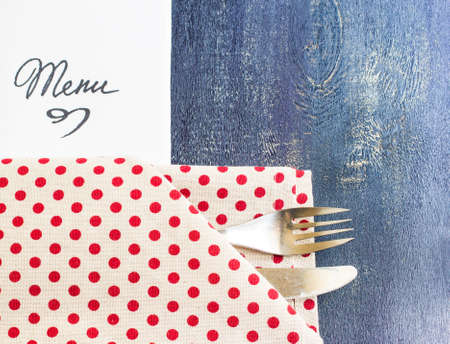 Restaurant menu design. Restaurant menu with empty plate and cutlery, on polka dot background with colorful napkin. Top view with copy space for text