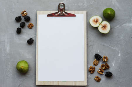 Recipe sheet and ingredients for salad: figs blackberry and walnut on white table. Top view