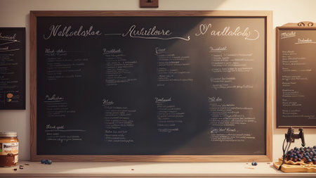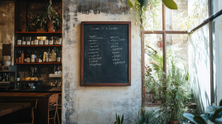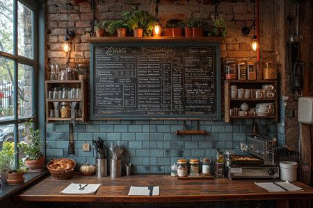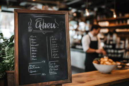 Chalkboard menu showcasing food and beverages in a trendy cafe setting, with a barista working in the background
