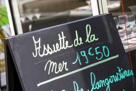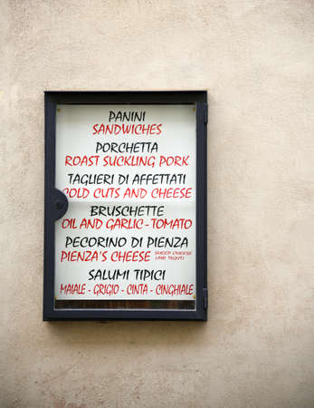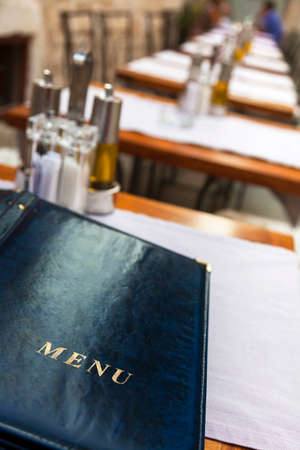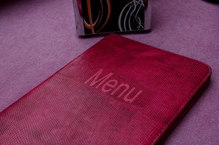 Colorful menu with knit cover on a table of a restaurant in Kotor, Montenegro