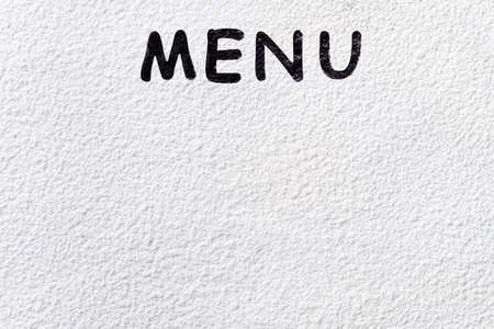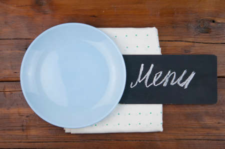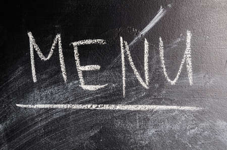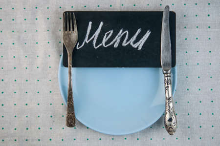 Menu title written with chalk on blackboard lying on tablecloth polka dot. Copy space for your text.