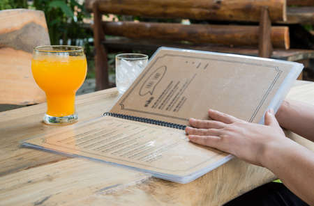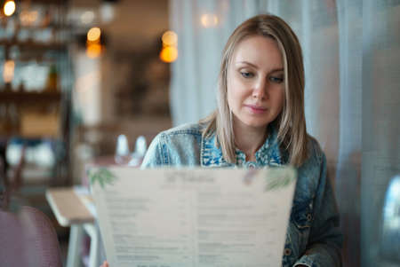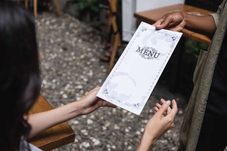 Close-up of unrecognizable woman reading menu while sitting at table with her colleague during business lunch in cafe