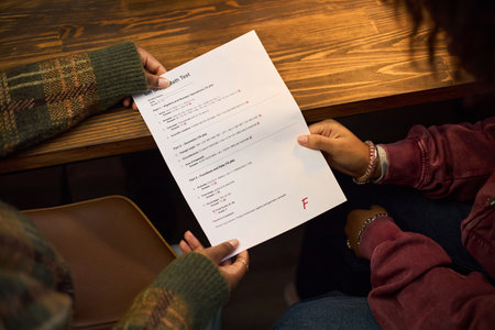 Two young adult women sitting at wooden table reviewing failed exam paper together, one woman holding test with visible red F grade, both focusing on academic results and discussing performance