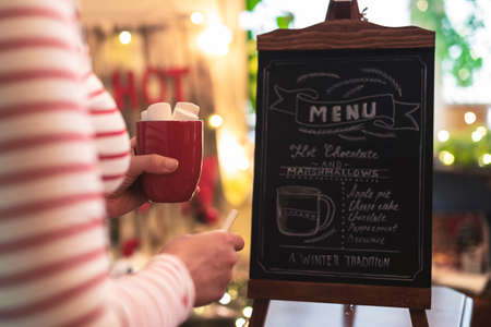 Woman with cup of cocoa with marshmallows drawing christmas menu of cocoa bar on small chalk board.