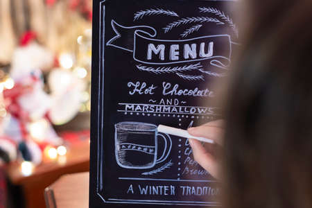 Woman drawing christmas menu of cocoa bar on small chalkboard.