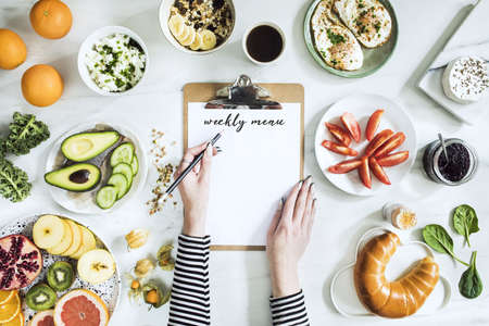Woman preparing healthy menu. Variety of vegetables, fruits and seeds on the kitchen marble table. Mock up project.. Top view.