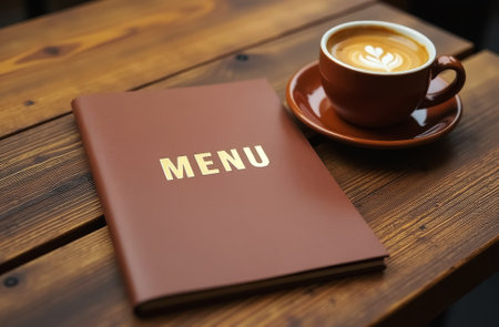 A visually appealing menu design showcased against a smooth background, accompanied by fresh green leaves, perfect for enhancing dining atmospheres.