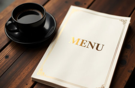 black cup with coffee on wooden table near white menu with golden letters, top view, close-up, restaurant or coffee shop menu mockup, advertising banner or flyer