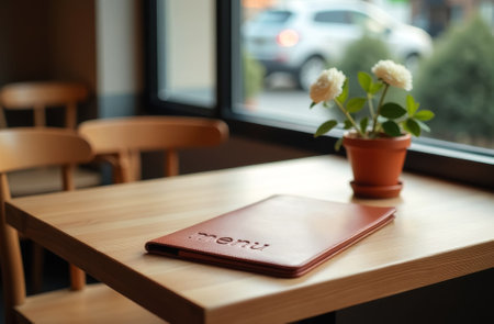 wooden table in a cafe with wooden chairs near the window, on the table lies a menu in a brown leather cover, next to it is a flower in a pot, outside the window is a sunny day, coffee shop advertising concept