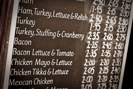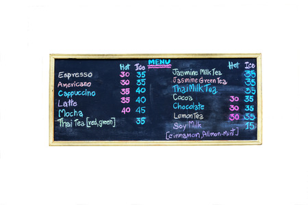 Espresso, cappuccino, latte sign. Hand drawing price text on black chalkboard, cooffee choise concept.