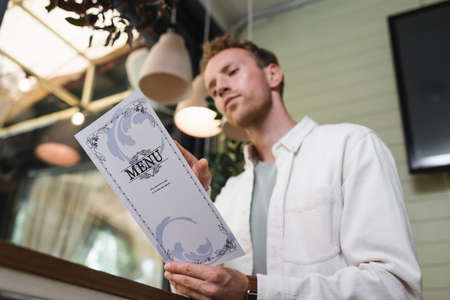 Multiethnic couple looking menu in luxury loft restaurant cafe. Mixed race people choosing italian food meal in modern stylish cafe pub. Two lovers going out together on romantic date. Dating concept.