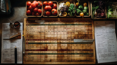 A wooden table showcases an array of fresh vegetables and herbs alongside recipe documentation, emphasizing the culinary preparation process in a kitchen.