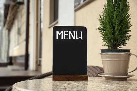 City street cafe (restaurant), early morning. Menu and fresh rose on the table. Food and drinks.