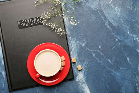 brown cup with coffee near brown menu with golden letters on wooden table, top view, close-up, restaurant or coffee shop menu mockup, advertising banner or flyer