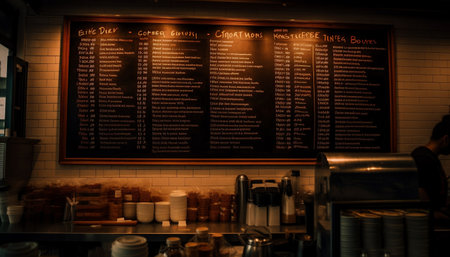 Men working inside food industry bar, illuminated by blackboard sign generated by artificial intelligence