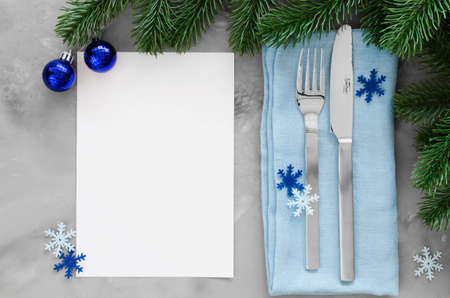 Background for writing the Christmas Menu. Winter Table Setting. Christmas tree, cutlery and blank paper. Top View, Copy Space.