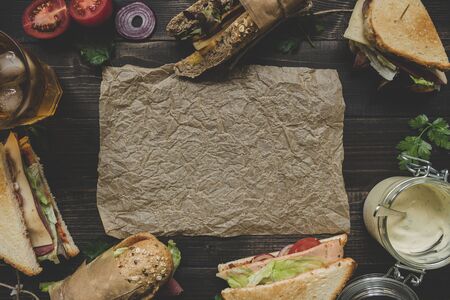 Fresh delicious sandwiches on the wooden dark table with copy space. Top view.