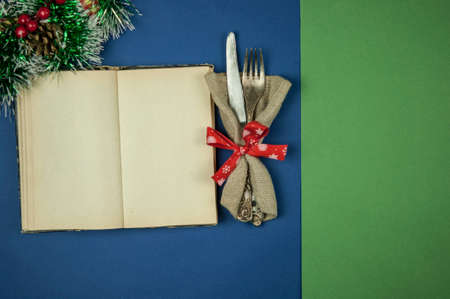 Vintage silverware decorated with red ribbon. Christmas menu. Copy space. Top view
