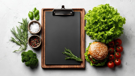 Menu template design flat lay. Black board, vegetables, good copy space