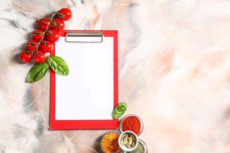 Clipboard with cooking ingredients and spices on color background