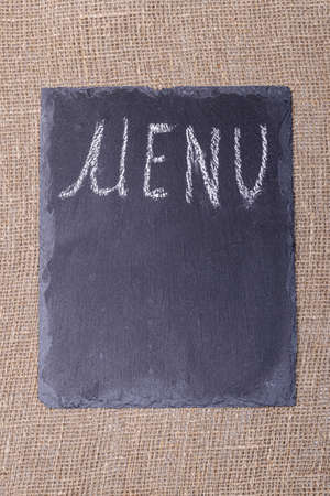 menu. an inscription on a black stone in white chalk. taken on burlap