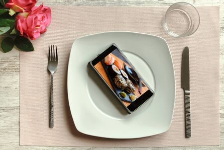 food blogger dessert smartphone lifestyle concept. creative vision. delicious cheesecake.