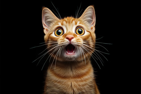 Surprised tabby cat opening mouth wide on black background